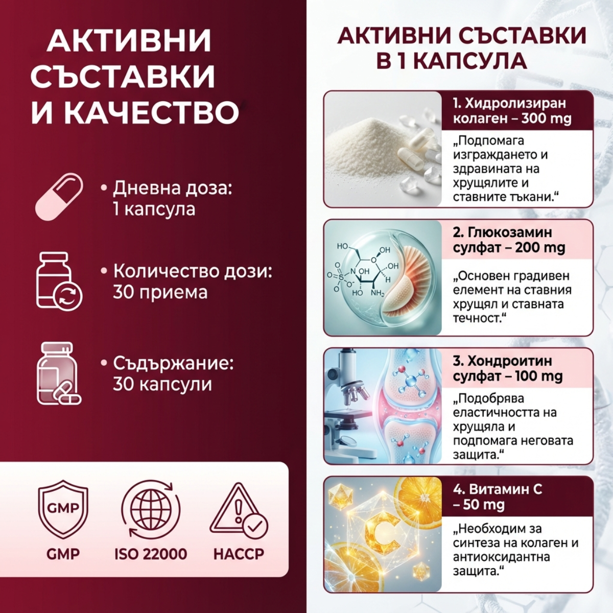 Комбинацията от колаген, глюкозамин и хондроитин подпомага структурата на хрущяла и „смазването“ на ставите, а витамин C подкрепя синтеза на колаген.